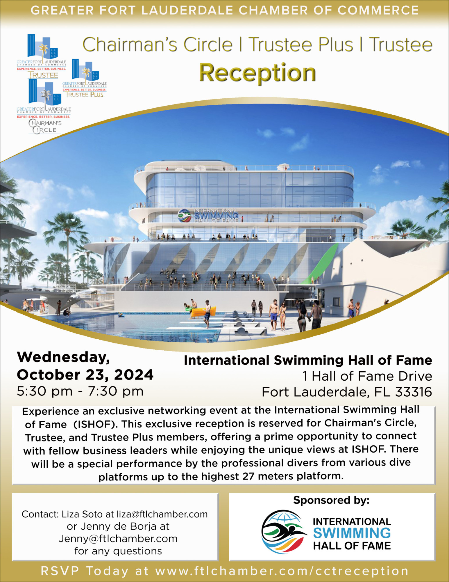 This exclusive reception is reserved for Chairman's Circle, Trustee Plus, and Trustee members, offering a prime opportunity to connect with fellow business leaders while enjoying the unique view at the International Swimming Hall of Fame (ISHOF). There will be a special performance featuring professional divers from various dive platforms, including those jumping from as high as 27 meters.