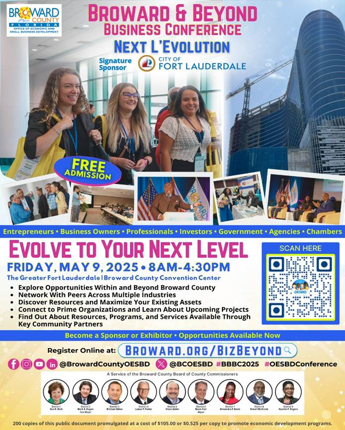 I’m inviting you to our Annual Broward & Beyond Business Conference on Friday, May 9th, 2025. Each year we convene over 800 businesses; mostly small businesses and we grant them access to more than 150 exhibitors and resources right here in Broward County. We have Keynote speakers and multiple presenters and panels to assist our participating audience in growing their business. Of course, if possible, we’d love to have your Sponsorship Support but if not, I would certainly look forward to seeing you there.