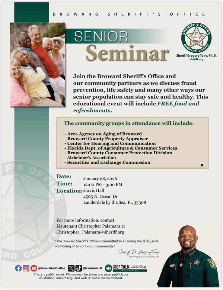 Please join the Broward Sheriff’s Office for their annual Senior Seminar on Wednesday, January 28, 2026, from 12:00 p.m. to 3:00 p.m. at Jarvis Hall in Lauderdale-by-the-Sea.