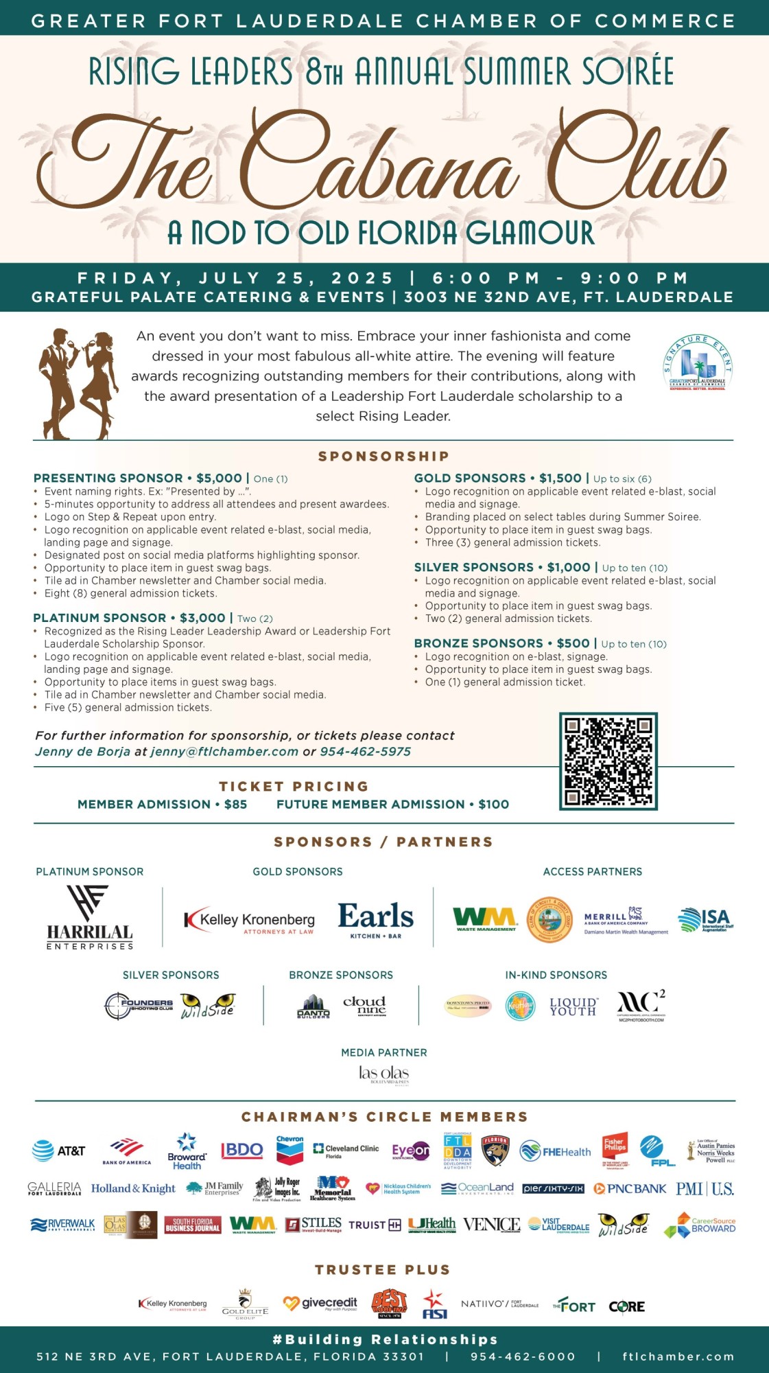 SOLD OUT--SOLD OUT. The 8th Annual Rising Leaders Summer Soirée is SOLD OUT and we will not be accepting any walk ins. The Soiree is hosted every July by the Greater Fort Lauderdale Chamber of Commerce’s Rising Leaders Council. Embrace your inner fashionista and come dressed in your most fabulous all-white attire. The evening will feature awards recognizing outstanding members for their contributions and a presentation of a Leadership Fort Lauderdale scholarship.