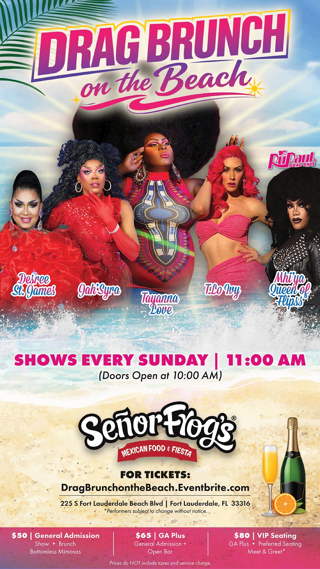 Get ready for a dazzling day of fun in the sun at the ultimate beachside celebration! Featuring Florida’s finest drag performers, including fan favorites from RuPaul’s Drag Race, this is the brunch experience you’ve been waiting for! Get $5 off for GA Plus and VIP seating using code BRUNCH5 at DragBrunchontheBeach.Eventbrite.com